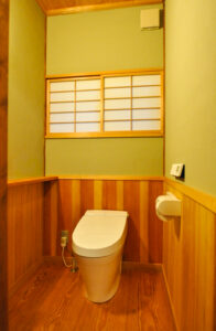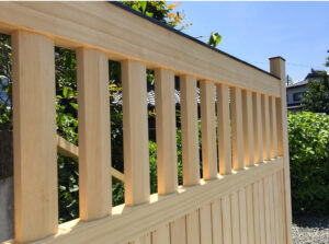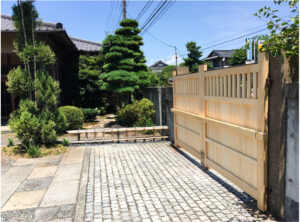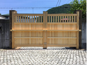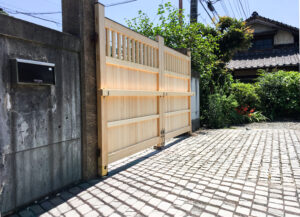 【リフォーム】 サヨリ門取り替え 静岡県沼津市 Y様邸 米ヒバを使用した門扉です。 扉1枚の巾が2メートルとかなり大きいものですが、 それを木組で支えています。 格子は兜巾面です。 【リフォーム】 廂と簾 静岡県熱海市 店舗 【リフォーム】 脂松を使ったトイレ 静岡県三島市 I様邸